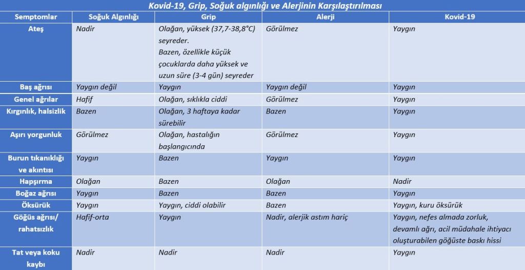 Grip ve Kovid-19 gibi, soğuk algınlığına da virüsler neden olmakta ve başkalarına bulaşabilmektedir. Soğuk algınlığı semptomları genelde hafif-orta şiddette kendini göstermektedir. Soğuk algınlığında görülen semptomlar arasında burun akıntısı, öksürük, tıkanıklık ve boğaz ağrısı bulunmaktadır. Ancak, Kovid-19 ve gripte görülen ağrılar ve ateş, genelde soğuk algınlığında görülmemekle birlikte semptomlar birkaç gün içinde kaybolmaktadır.
